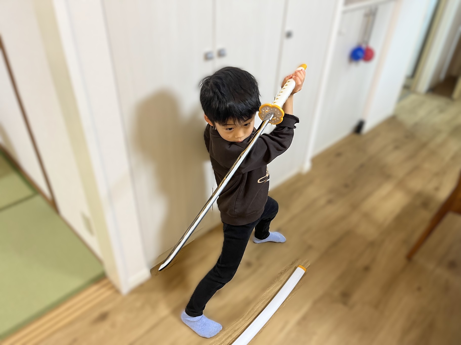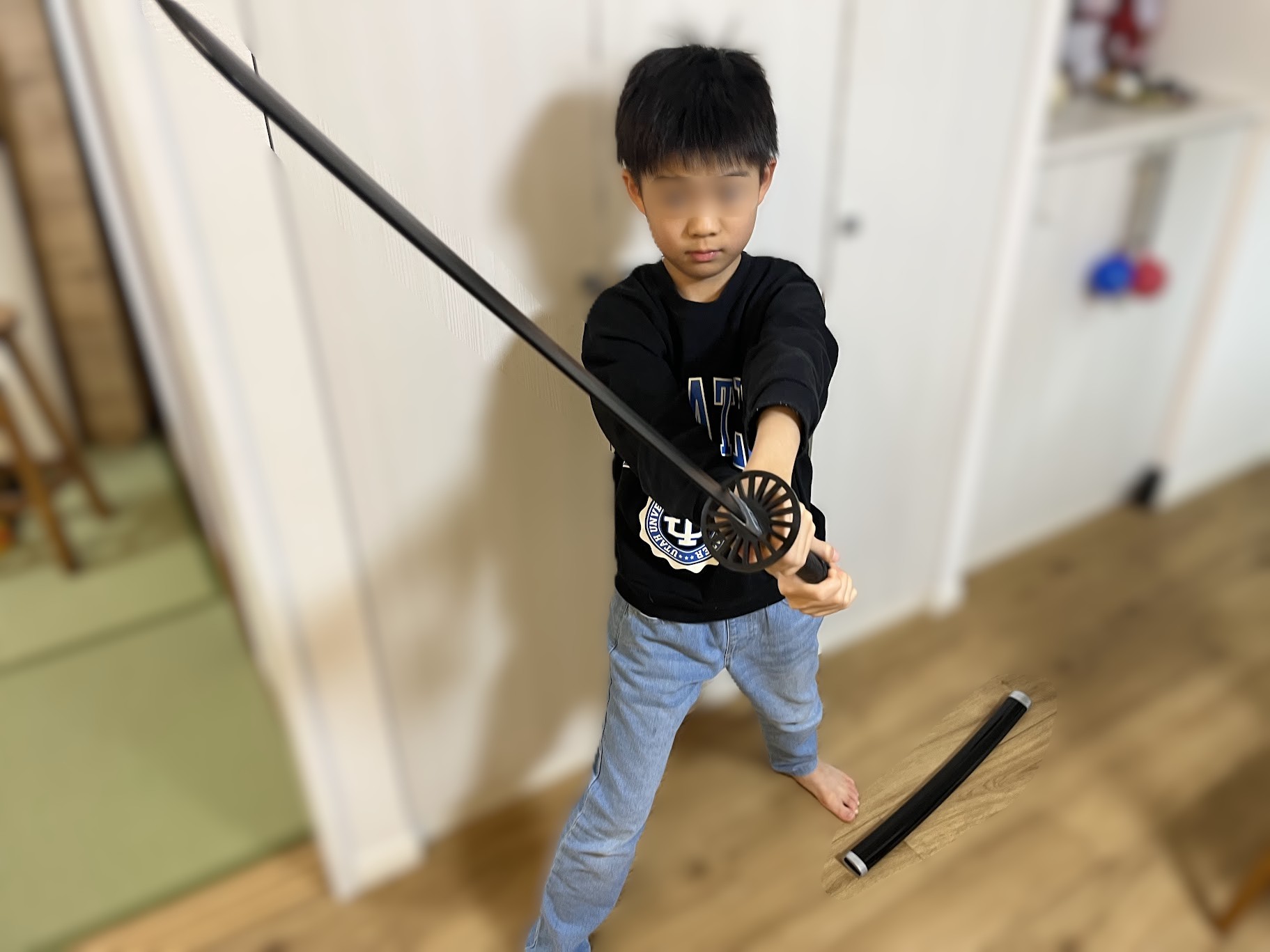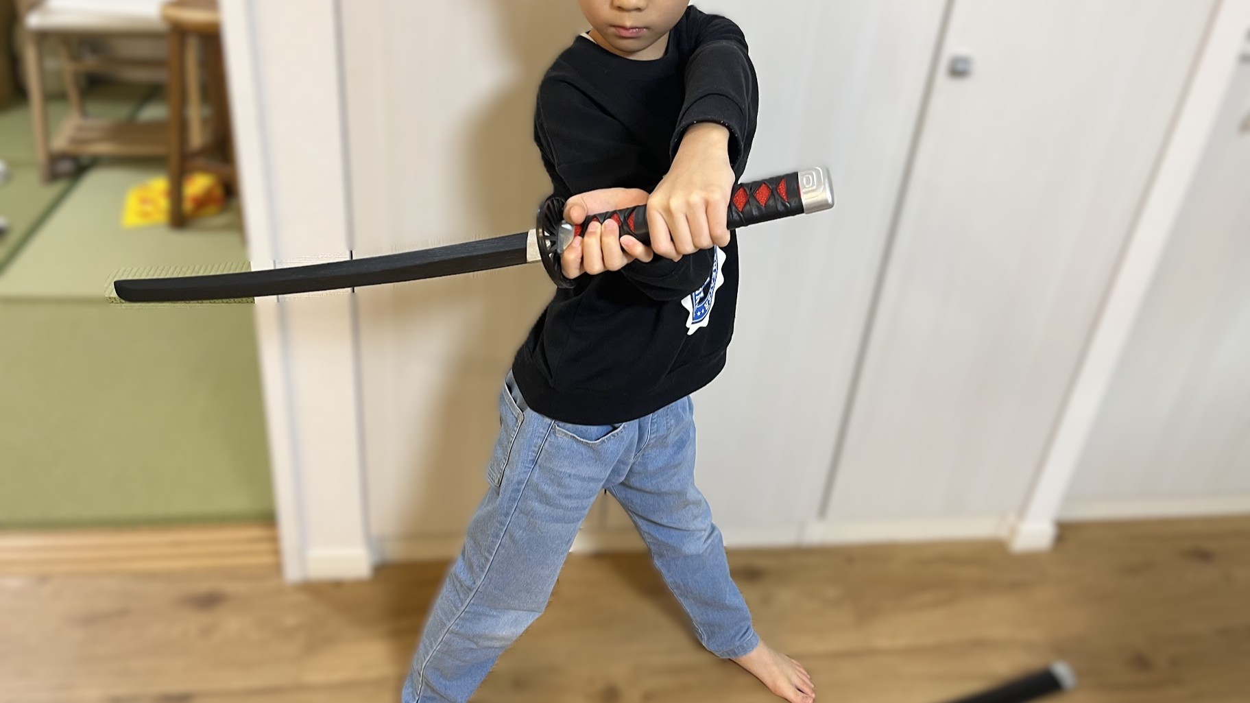 → 基本的には振り回さないで遊んでもらうのですが、やっぱり刀なので振り回したい気持ちも分かるので、室内で使うなら、6畳間以上で家具などが少ないスペースを用意できるとよいです。