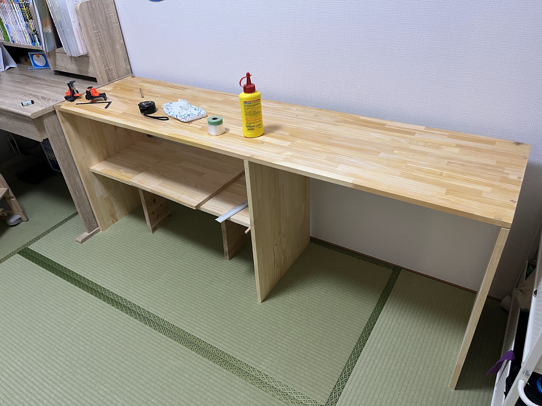 - 手持ちで持ち帰れるサイズは1820㎜くらいが限界だったので、最大限の幅を使って机の天板を作ります。棚が支えの脚になってくれるので安定感は問題なし!