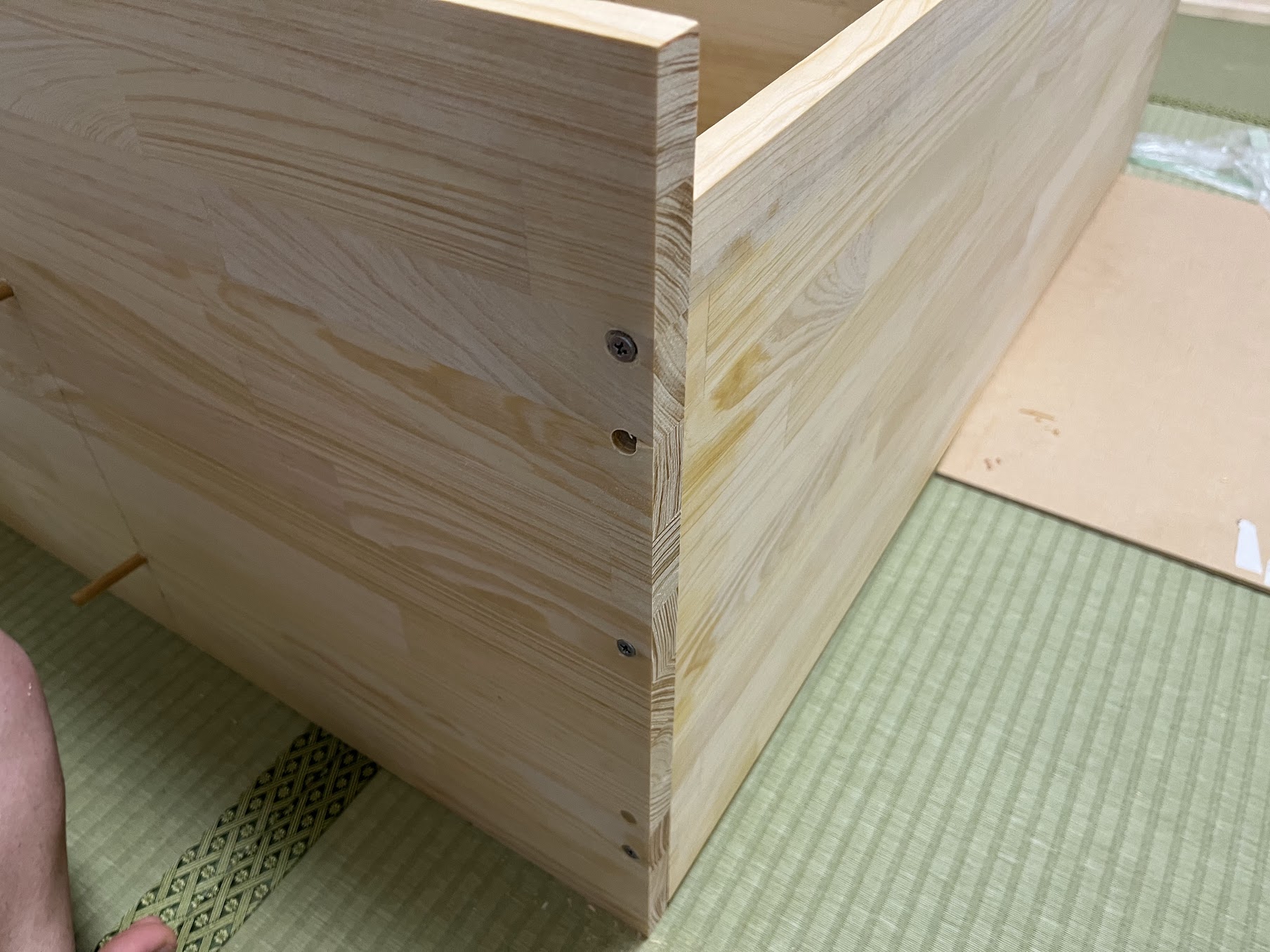- 側板・前板・後板をボンド+ネジで箱状に。