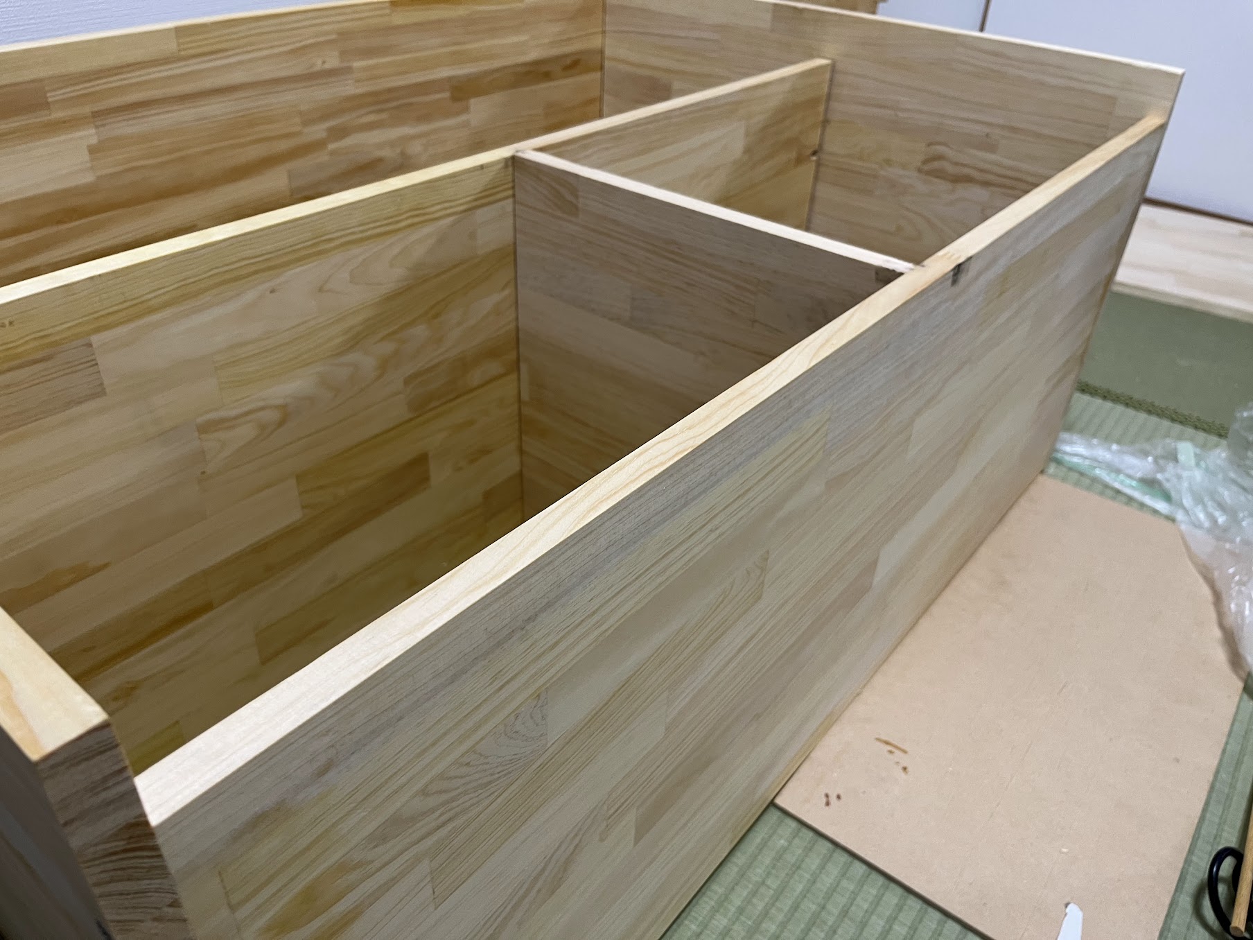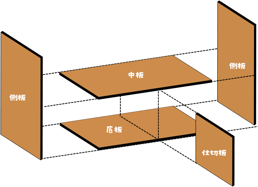 購入するもともとの板のサイズから効率的に材料をカットする関係で側板よりも底板、中板は少し短くなっています。
