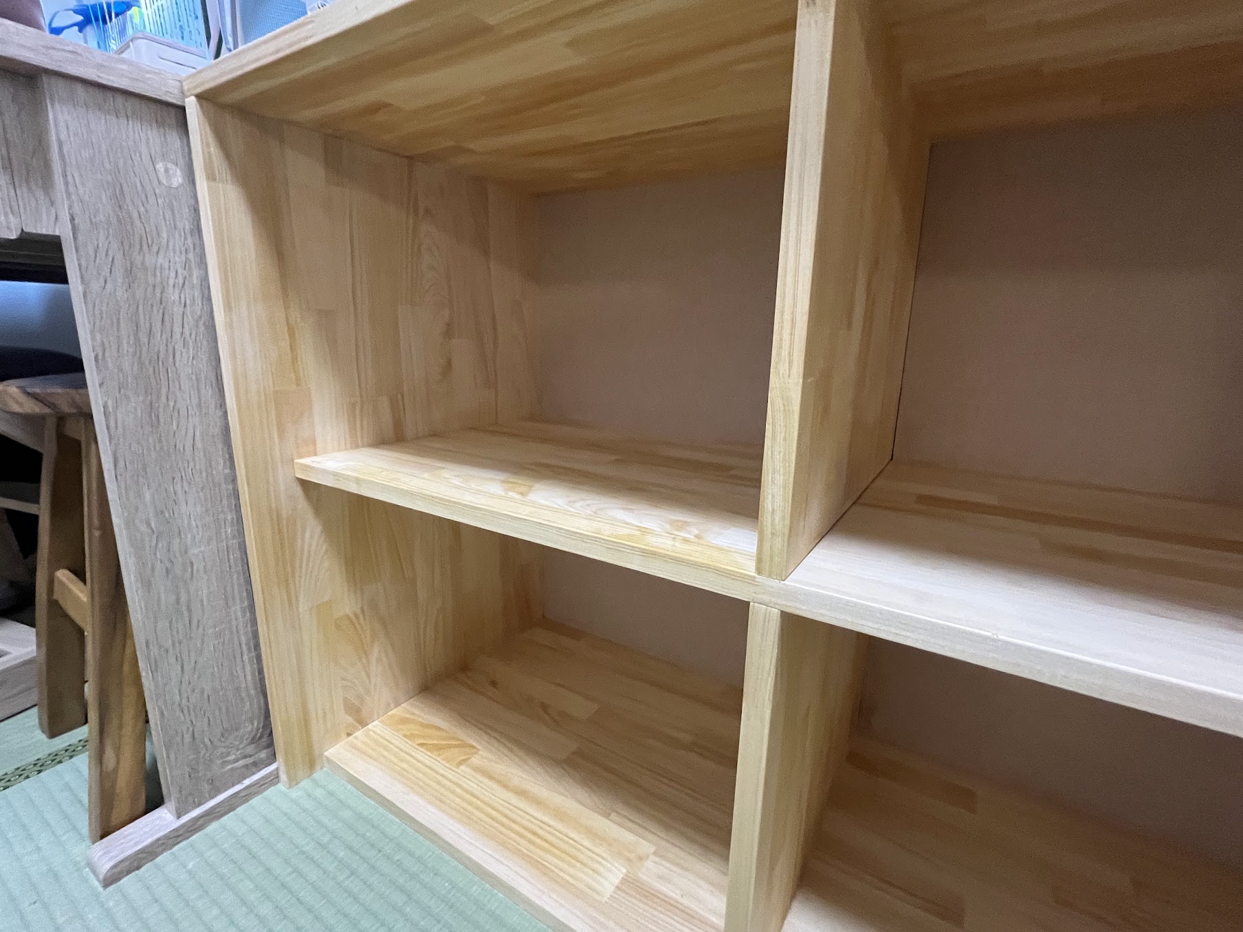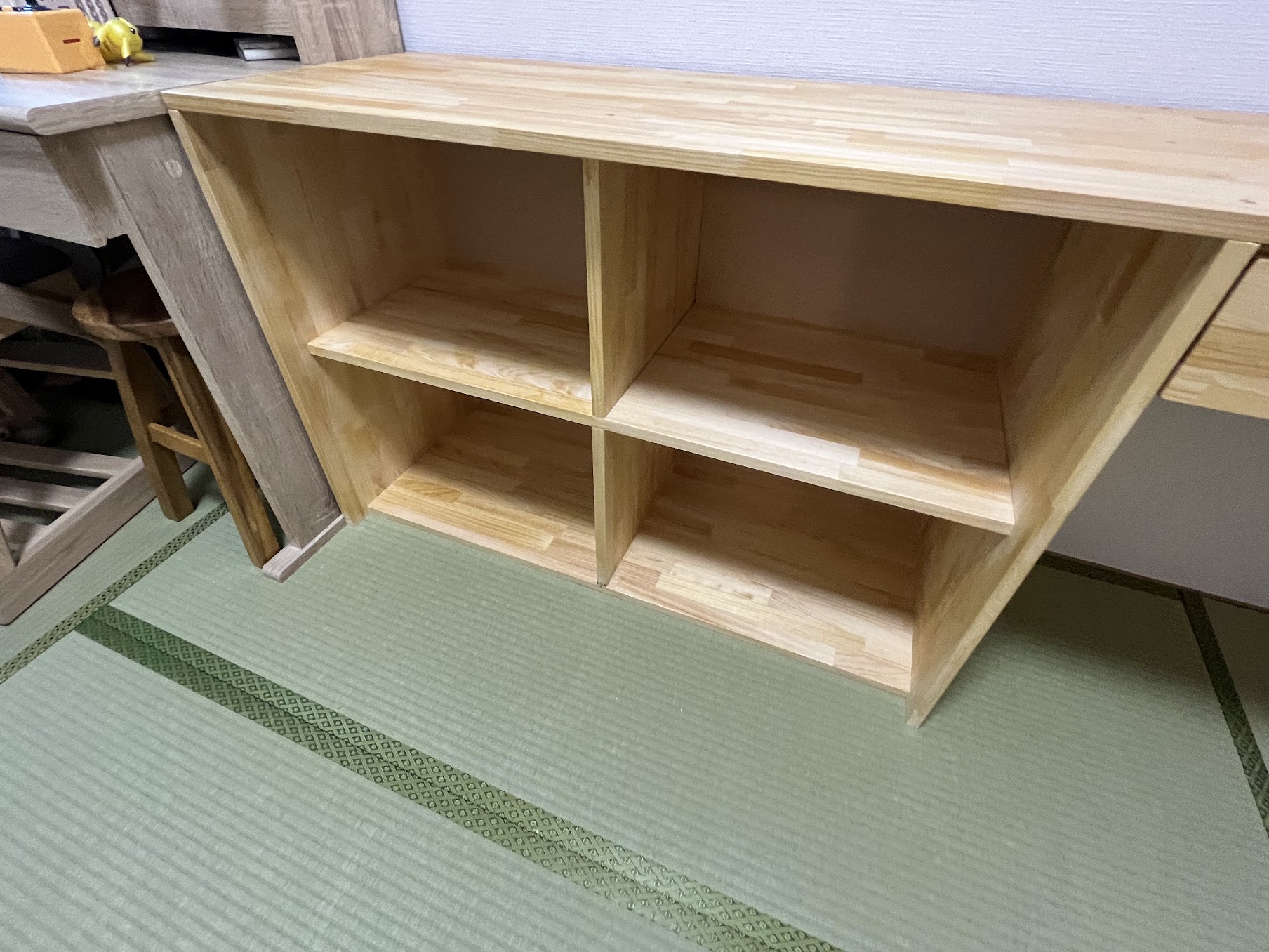 - 真ん中あたりに棚板を1枚ずつ入れて、4つの収納スペースに。