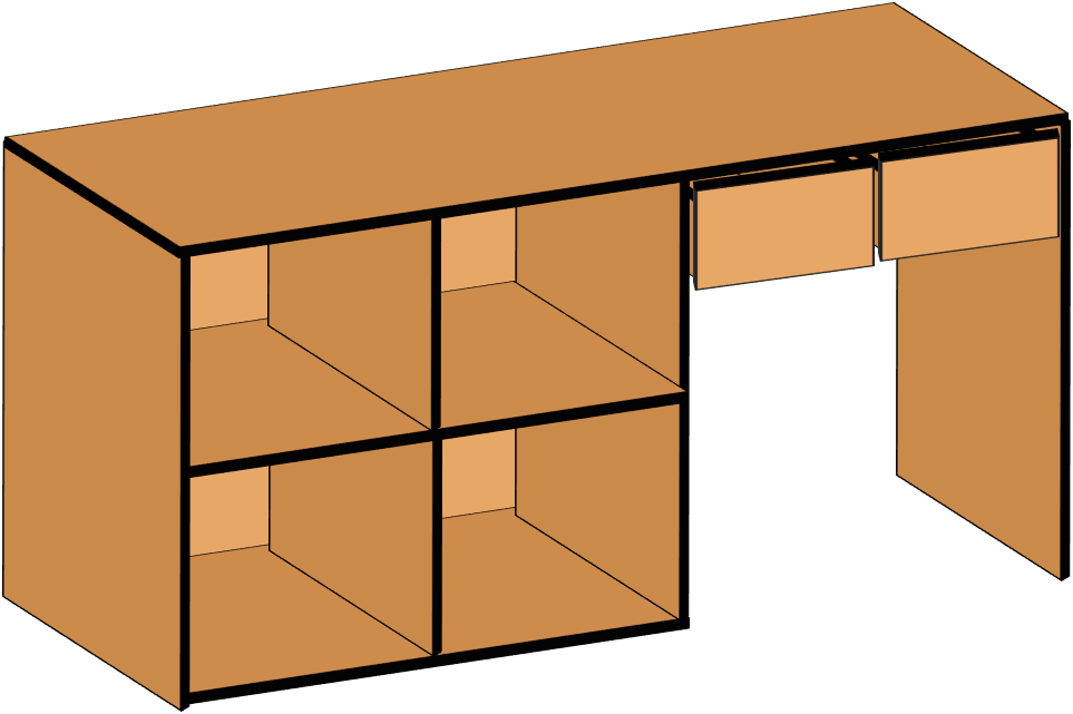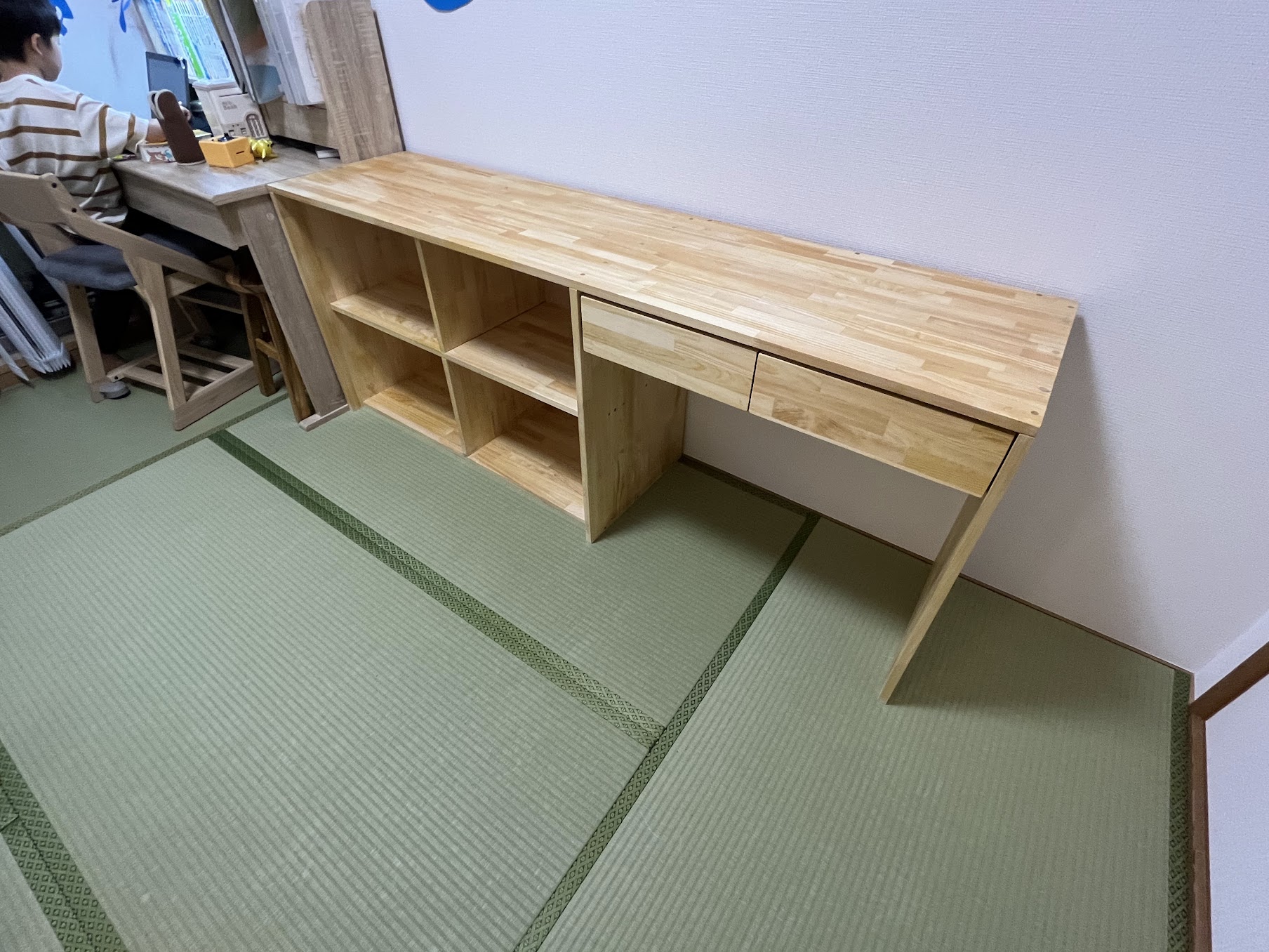- 右側:引き出し2か所付きのシンプルなデスク