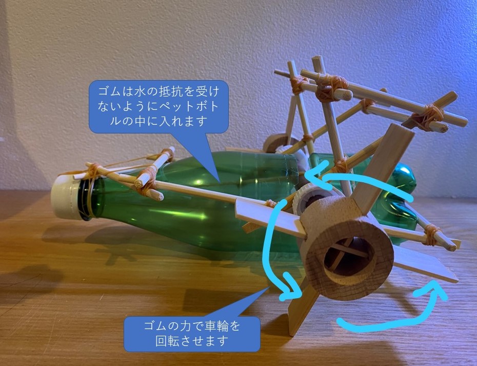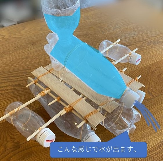 ペットボトルに入れた水がキャップにあけた穴から飛び出すことによって、その反動で船を動かす仕組みです。