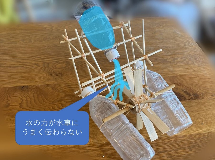 さらに水車の側面がないので、当たった水が両側に逃げてしまい、水の重量の全部を羽部分に伝えることができませんでした。