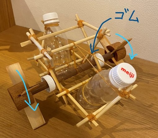 基本的に本体部分は、割りばしと薄めの板材とペットボトルを使って、くっつけるのには輪ゴムと紐のみを使用して作ることにしました。